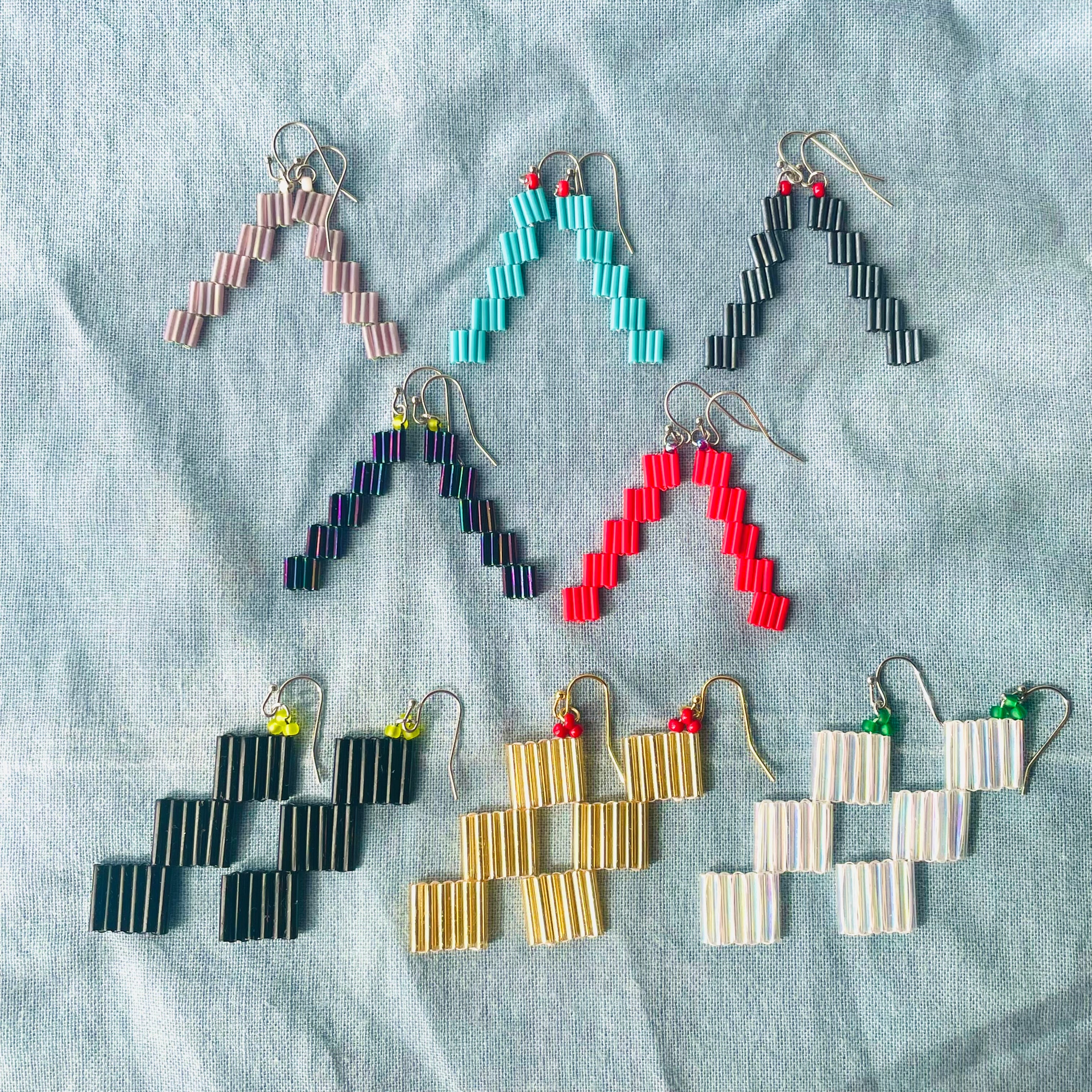 竹ビーズと呼ばれる細長いガラスビーズを丁寧に編み、五連のスクエアをデザインしました。お色は深い輝きのメタリックパープルにネオングリーンを合わせました。金具はシルバーになります。