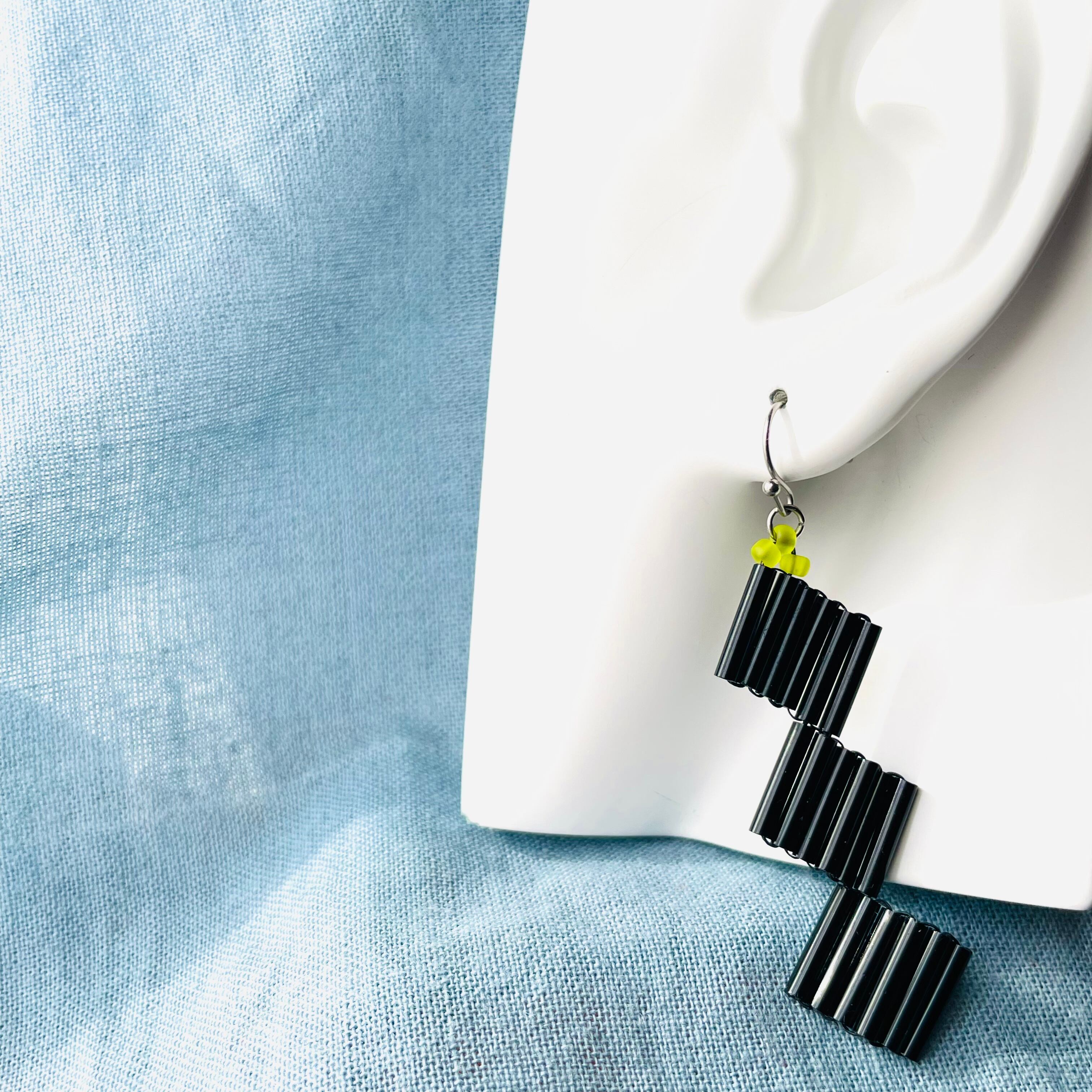 竹ビーズと呼ばれる細長いガラスビーズを丁寧に編み、三連のスクエアをデザインしました。お色はブラックにワンポイントのネオングリーンを合わせました。金具はシルバーになります。