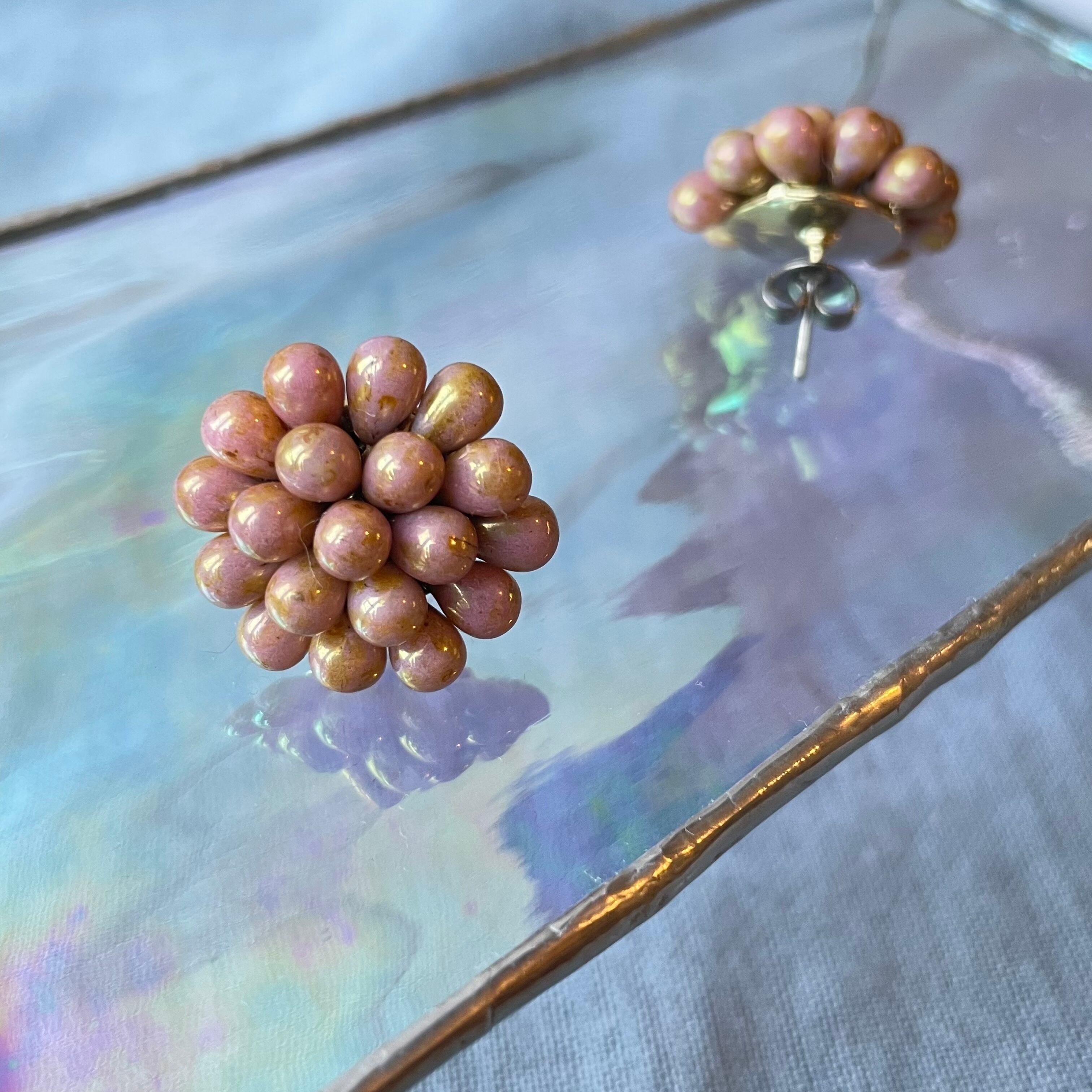ドロップビーズやティアドロップビーズと呼ばれる、しずく型のチェコビーズを使用した、フラワーモチーフのピアス/イヤリングです。
