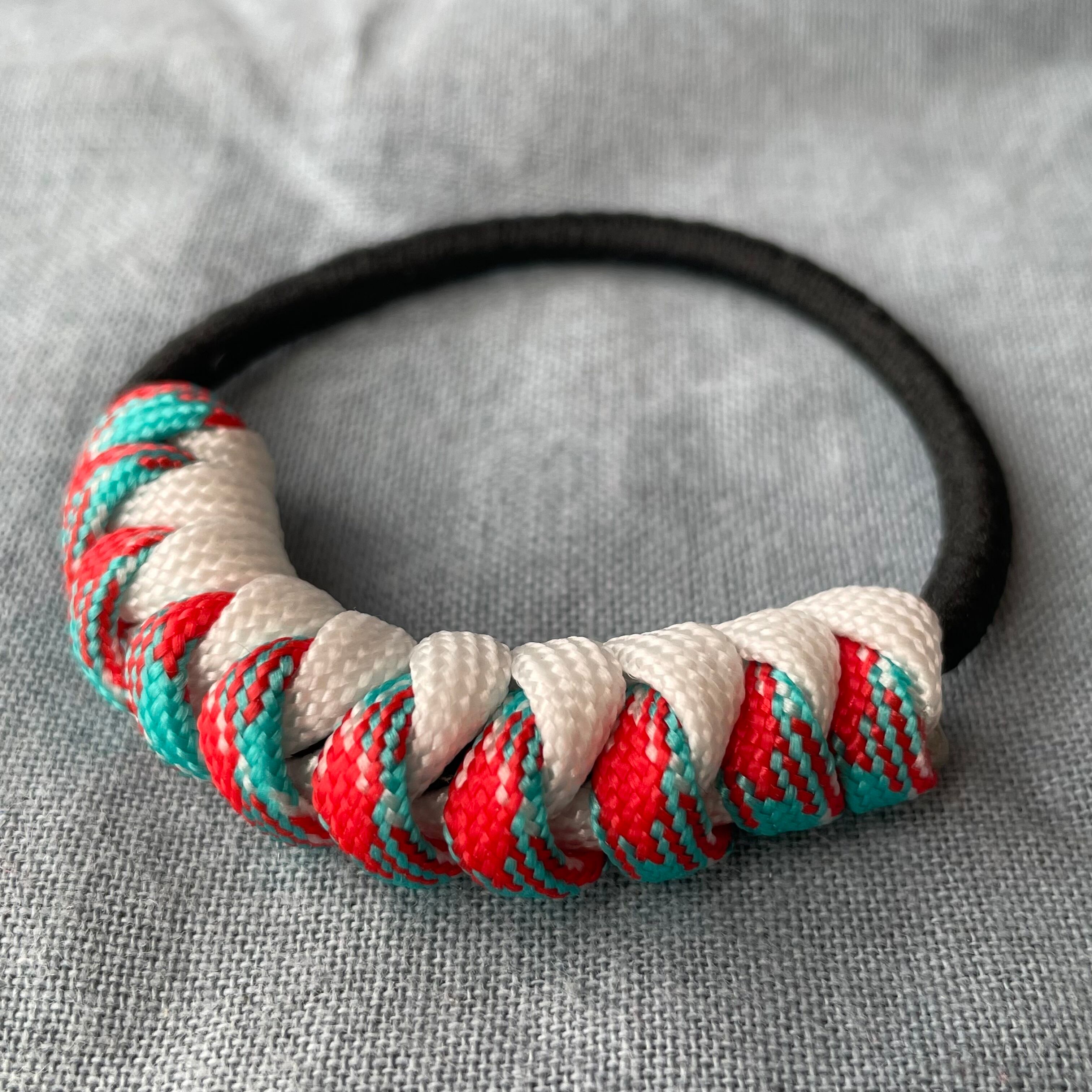 パラコードを丁寧に編んで作った、シンプルながら凝ったデザインのヘアゴムです。スネークノットという折り重なるように結び目が連なっていく、流れるようなデザイン、お色は髪色に映える、ホワイト/ターコイズレッドです。