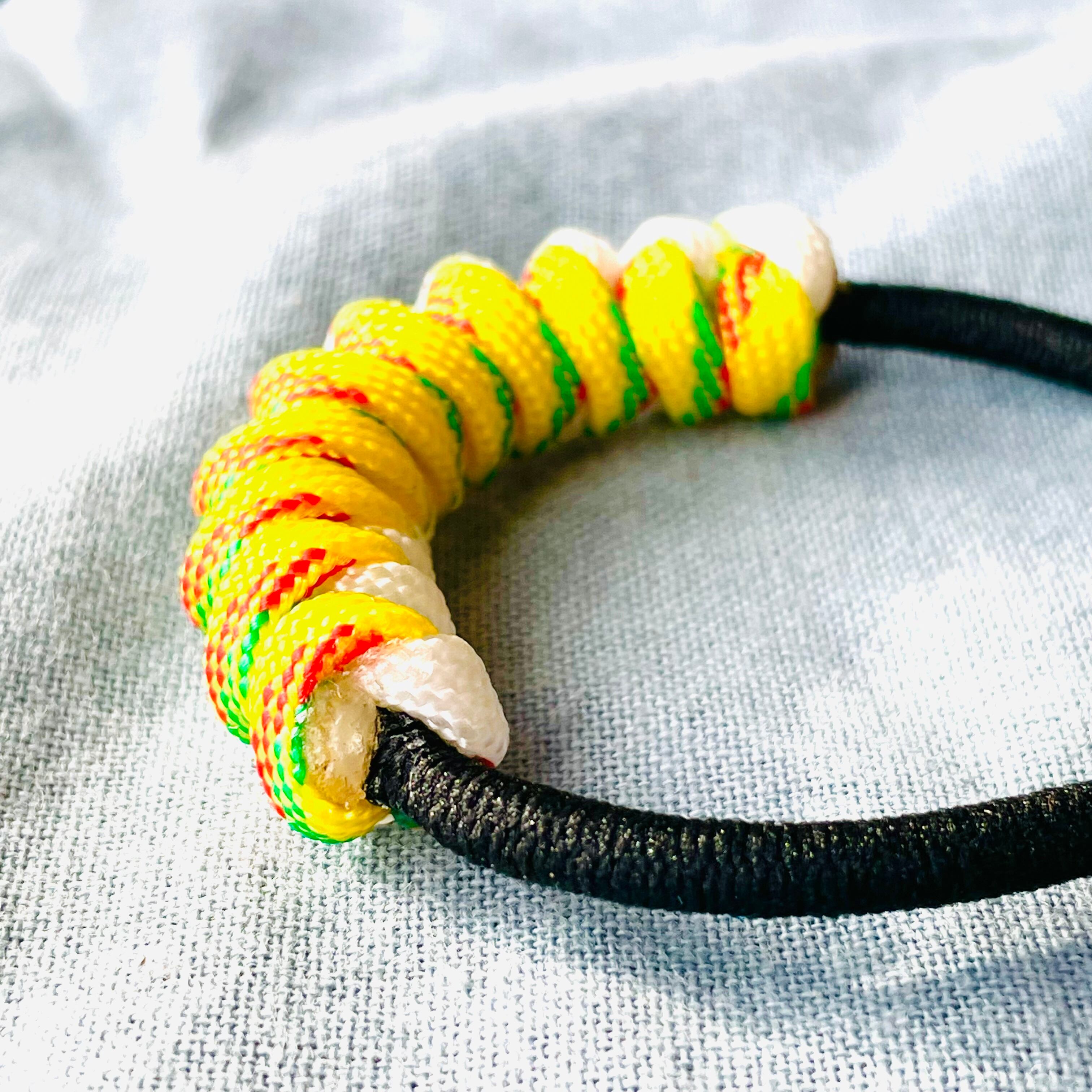 パラコードを丁寧に編んで作った、シンプルながら凝ったデザインのヘアゴムです。スネークノットという折り重なるように結び目が連なっていく、流れるようなデザイン、お色は髪色に映える、イエローミックス/ホワイトです。