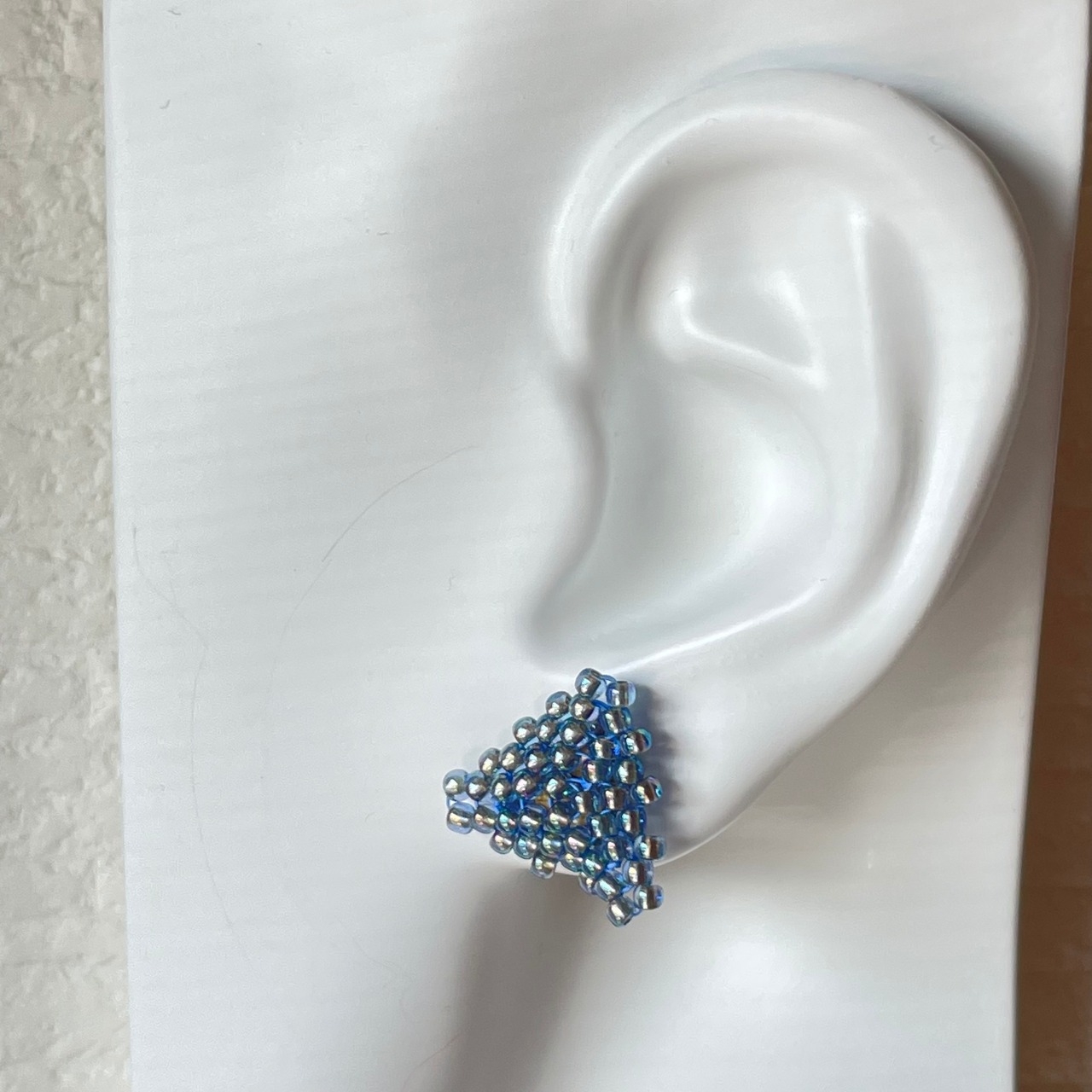 玉虫色に輝く美しい偏光ヒヤシンスブルーの小さなビーズを、強度のある糸でひとつひとつ丁寧に三角形に編み上げました。