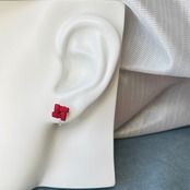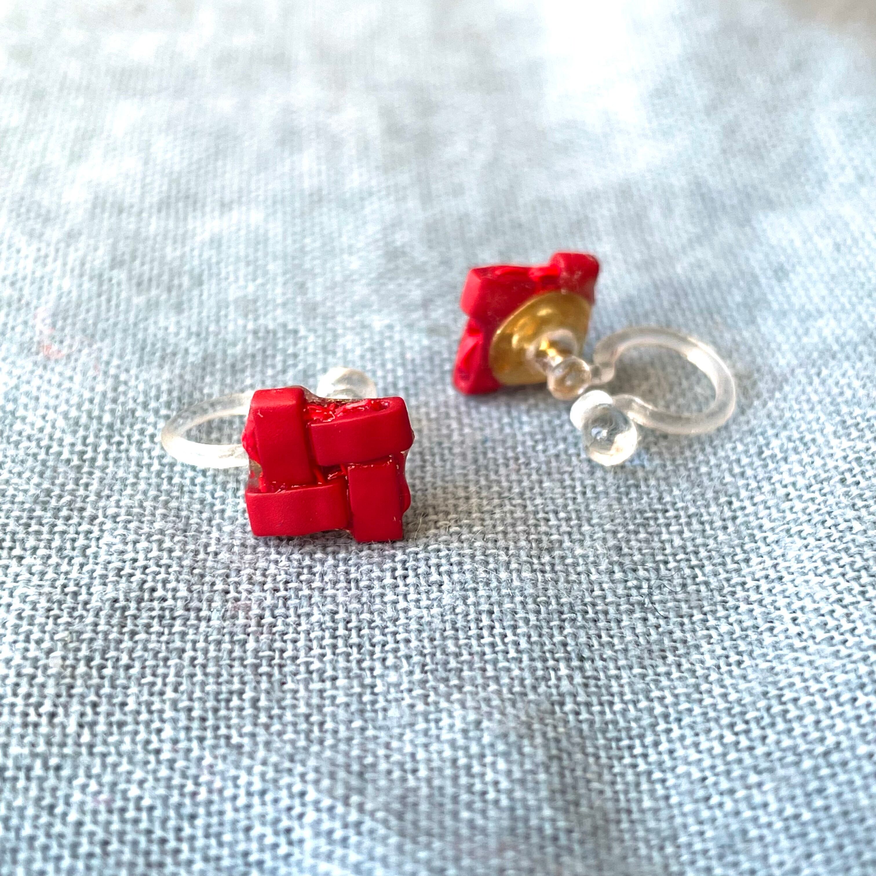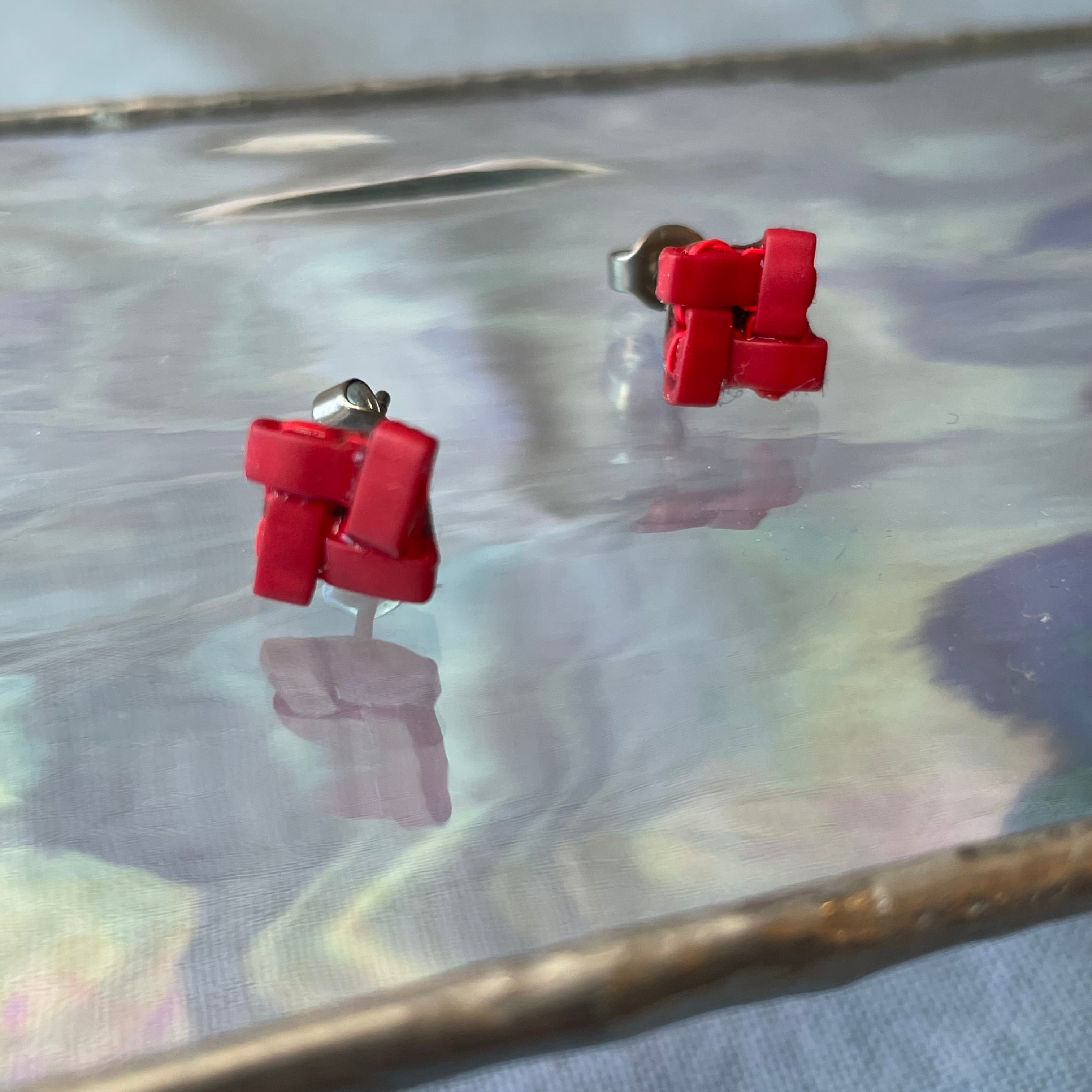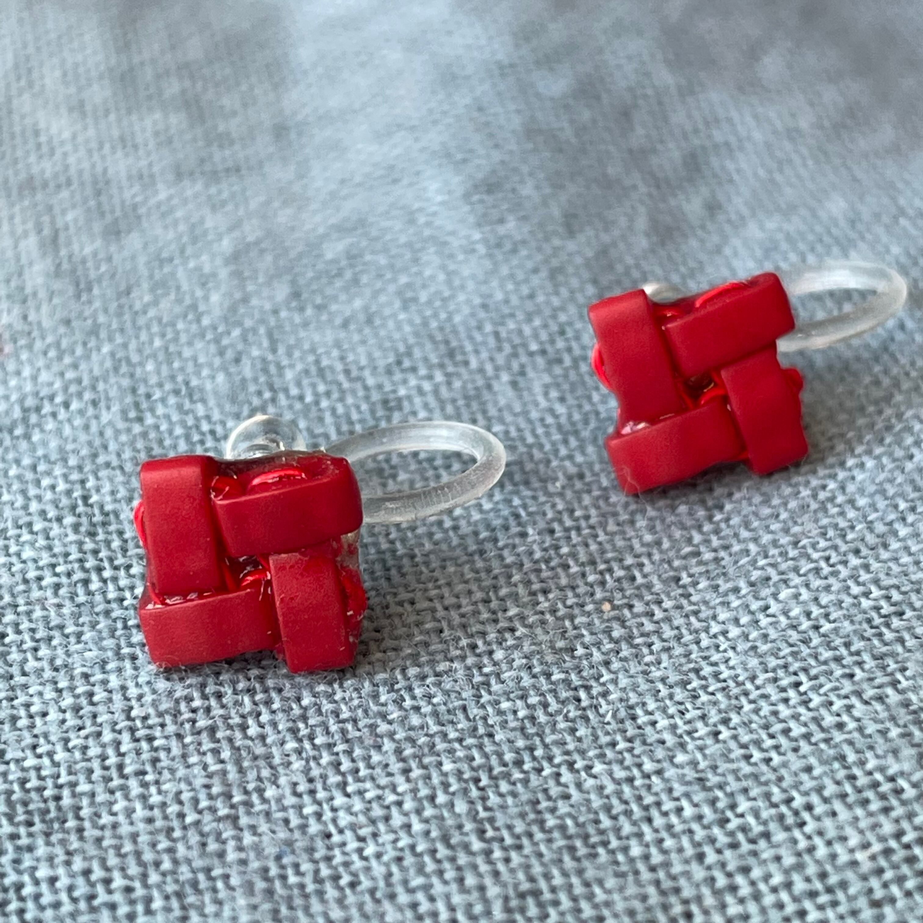ハーフティラビーズという四角い国産のビーズを編み、小さなピアス/イヤリングを作りました。お色はマットレッドです。